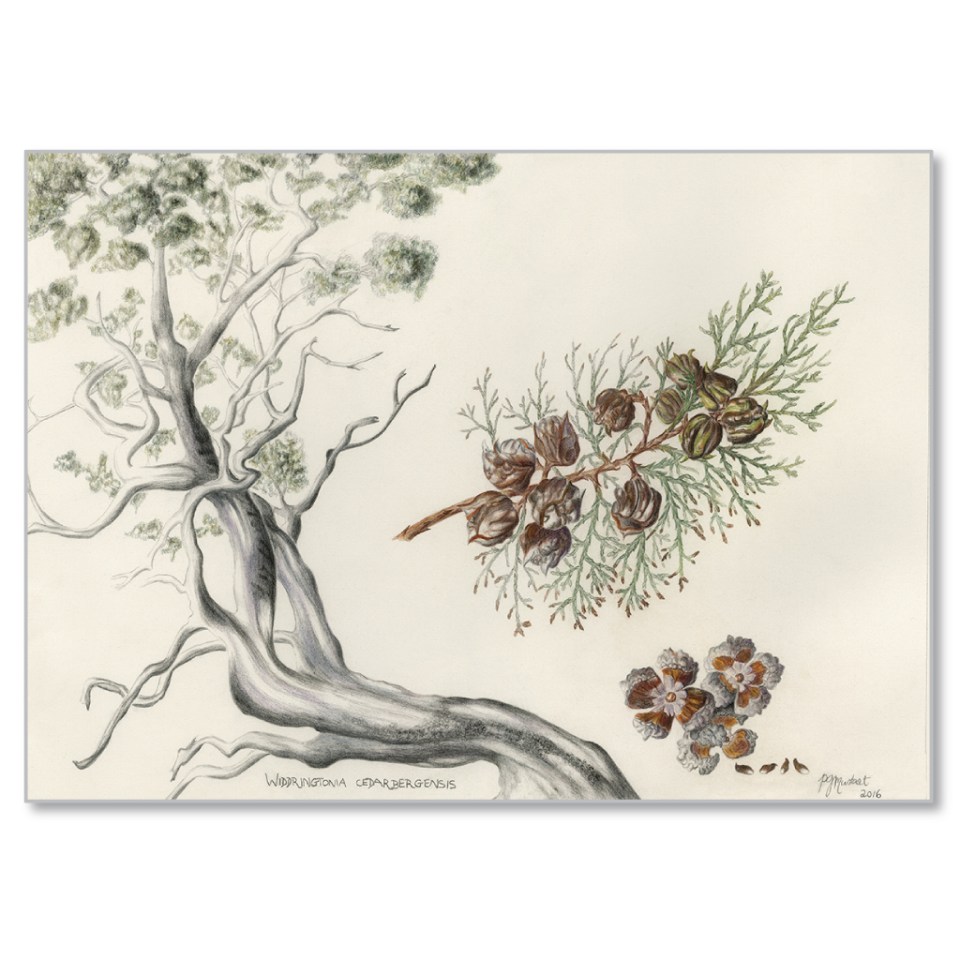 Marvellous botanical watercolour of the Clanwilliam Cedar by artist Penny Mustart. (Rtrvd. 2017-04-18)